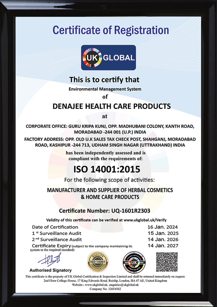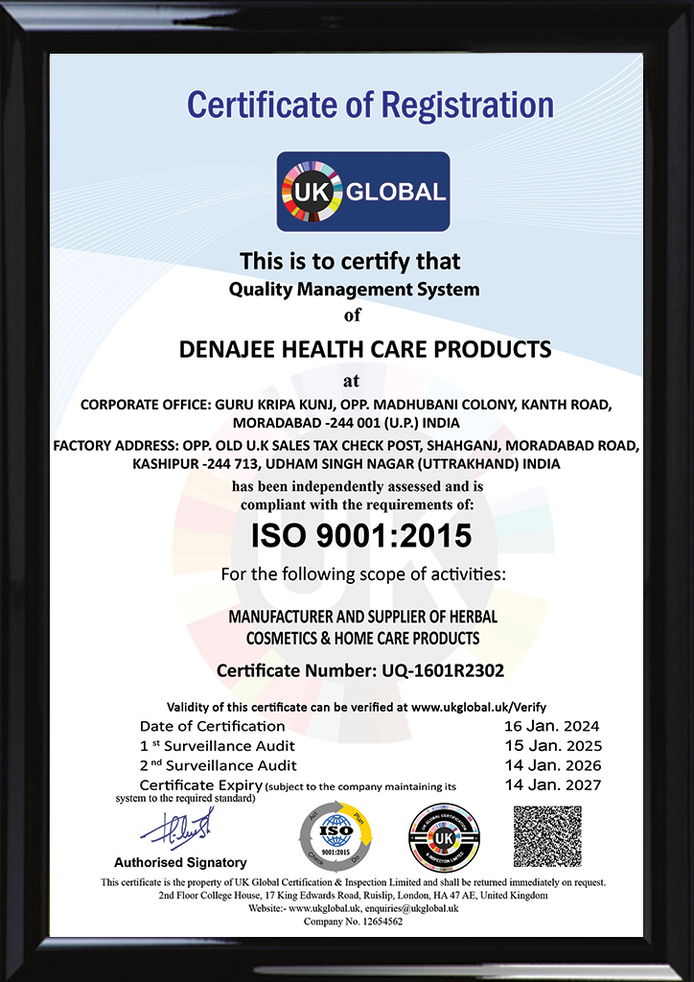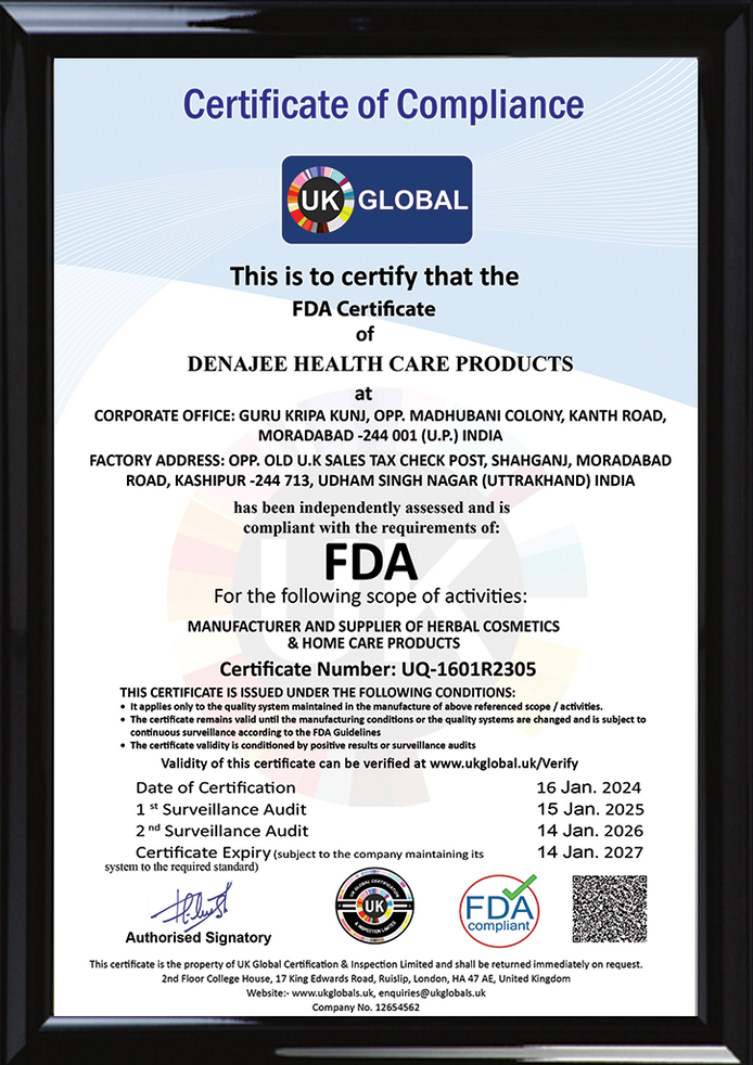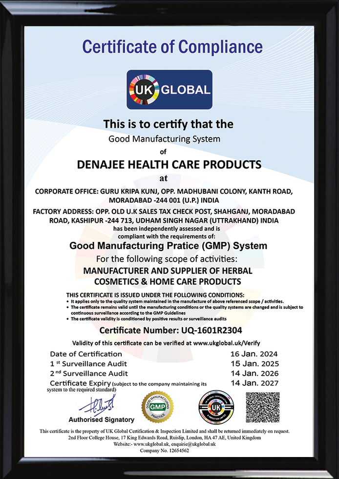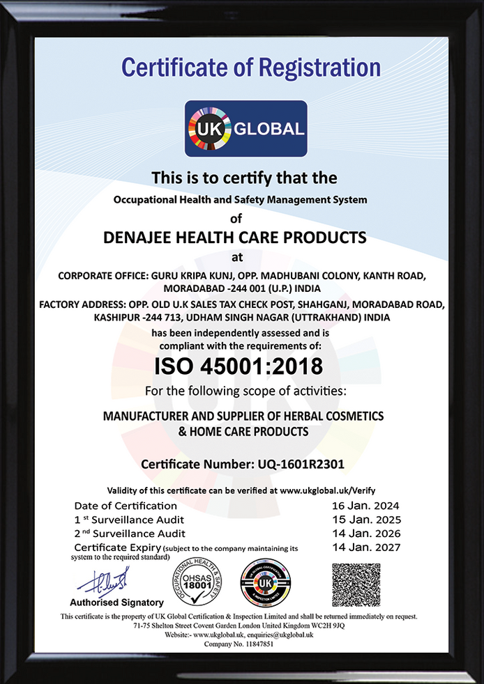 DENAJEE HEALTH CARE PRODUCTS Are Committed On Making Best Quality Products, In This Way We Are Continuously Improving Ourselves To Make Products Keeping In Mind Of High Quality Standards And Safety Standards Which Are Required For Certifications, Thus Company Has Qualified Some Certifications Required For Manufacturing Herbal Cosmetics And Home Care Products.