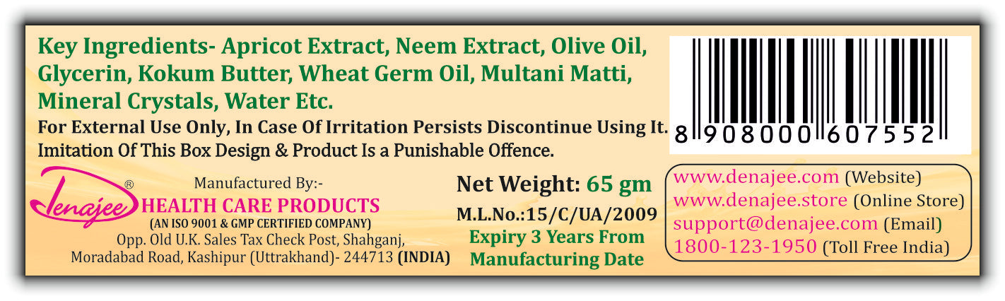 - Great Combination Of Herbal Actives Like Apricot Extract, Neem Extract, Olive Oil, Kokum Butter, Wheat Germ Oil, Glycerin, Multani Matti Etc.